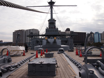 ごはんを食べた後は、記念艦三笠へ。『坂の上の雲』でもお馴染み、日露戦争時の日本海海戦で活躍した戦艦です。太平洋戦争後に色々資材として引っぺがされたり米軍にキャバレー開かれたりしたので当時のそのものではなくて、ほぼレプリカなんだけど。ここも前回来た時、年末で閉館しててさー!