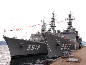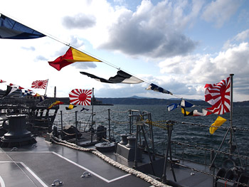 今回の見学対象は練習艦「しらゆき」でした。23日は天皇誕生日ということで、みんな満艦飾してて!はああ……初めて見た満艦飾……。同じバースには訓練支援艦の「くろべ」や掃海母艦の「ぶんご」もいて、遠くには「おおすみ」や「いせ」も見れて!ひゅうがは二回神戸に来てくれたけど、いせは初めて見た~。前に呉に来た時は、ちょうどいせがよそで一般公開してたし、11月の神戸の防災訓練は「いせが来るの厭って言ったからひゅうがが来ることになった」って話でw あと、おおすみさんは強襲揚陸艦だよね、って話してた。護衛艦です。毎回思うんだけど、「強襲揚陸艦」って字面がすごい。